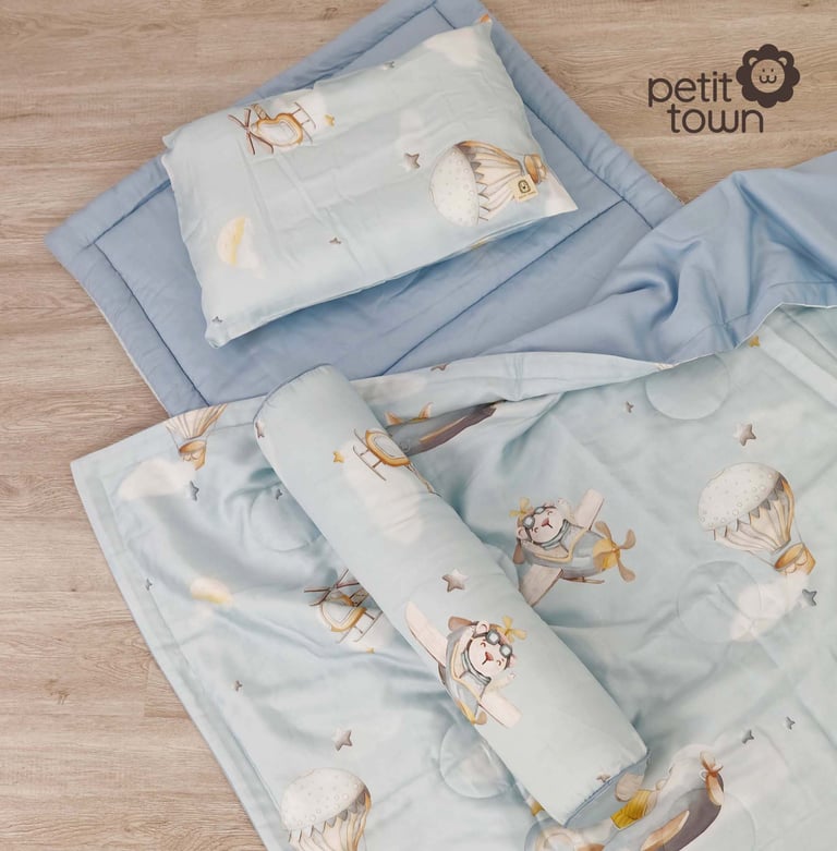 Set đệm - chăn - gối đi học vải tencel của Petit Town bao gồm: