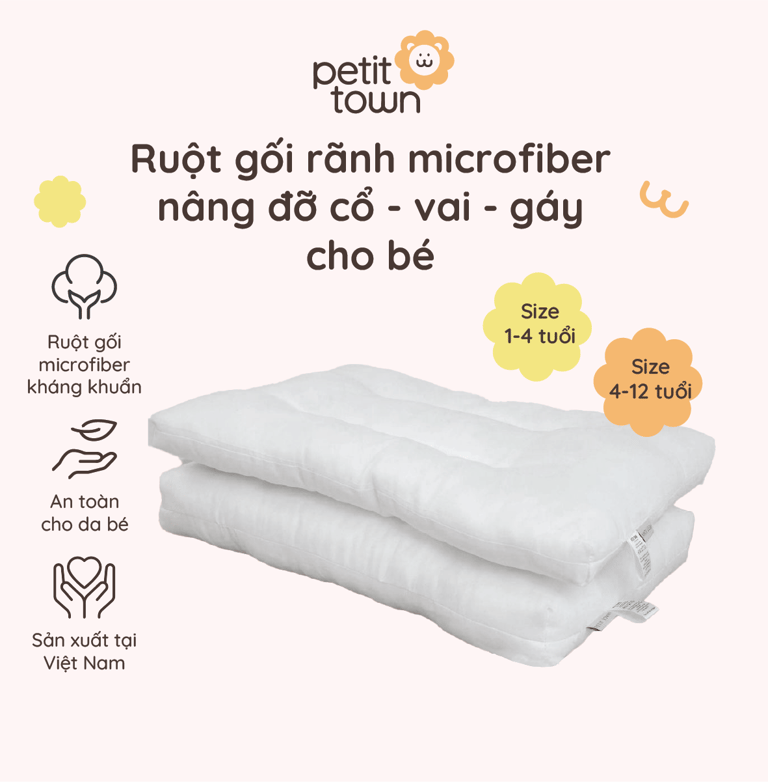 Ruột gối trong set đang mặc định là ruột gối microfiber kháng khuẩn, nếu bố mẹ thấy không phù hợp với con thì có thể chọn sang loại ruột gối rãnh chống ngạt, nâng đỡ cổ vai gáy này nha. Gối này thì giữ form tốt, có độ lún vừa phải và có 2 size để mình lựa chọn:
